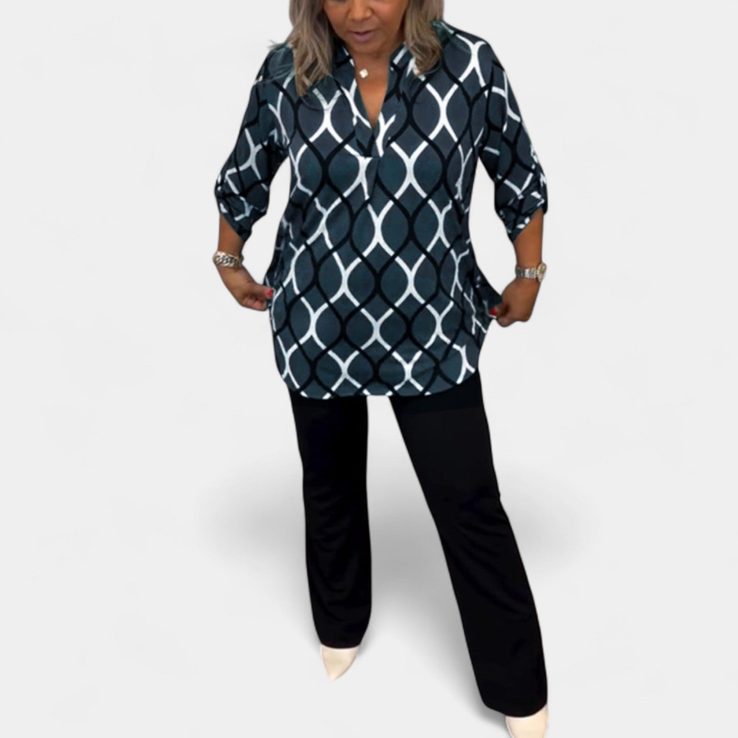Halenka Petra zaujme svým originálním grafickým vzorem, který okamžitě rozzáří každý look. Díky volnějšímu střihu a tříčtvrtečním rukávům působí pohodlně i elegantně zároveň. Perfektní volba jak k elegantním kalhotám, tak k ležérním džínám.