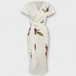 Okouzlující midi šaty se zavinovacím stylem a živým listovým potiskem, které lichotí postavě díky V-výstřihu. Ideální pro jakoukoli příležitost, od brunchů po venkovní akce.
