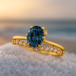 Objevte prsten Lovamis, který ztělesňuje věčný tanec hlubokých proudů. S jeho tekutou, propletenou formou vyjadřuje živou sílu oceánu – elegantní energii, která nepotřebuje bouři. Jasně modré odstíny připomínají vodu, která proudí pod lunární září, a každý detail je poctou nezkrotné barvě moře. Tento prsten je talismanem pro všechny, kteří nosí v sobě tajemství a sílu vln.